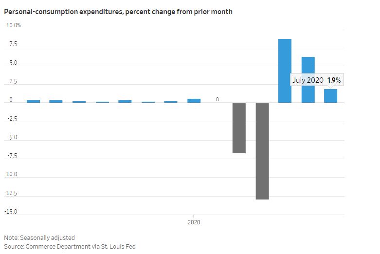 Los gastos de consumo personal, una medida del gasto de los hogares en general, desde cortes de cabello hasta autos nuevos, aumentaron un 1,9% ajustado estacionalmente en julio con respecto al mes anterior, dijo el viernes el Departamento de Comercio.