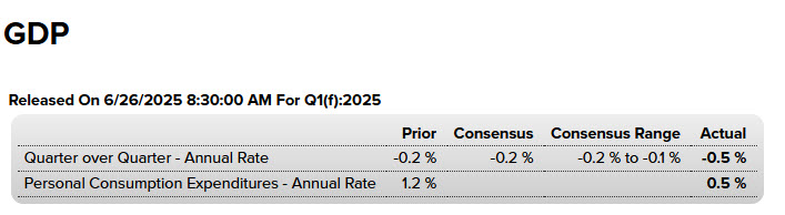 El producto interior bruto disminuyó a una tasa anualizada revisada a la baja del 0.5% el trimestre pasado, según informó la Oficina de Análisis Económico (BEA) del Departamento de Comercio en su tercera estimación del PIB el jueves. Anteriormente se había informado que había caído a un ritmo del 0.2%. La revisión reflejó una fuerte reducción del gasto de consumo, que ahora se estima que aumentó a un ritmo de tan solo el 0.5%, en lugar del 1.2% informado anteriormente.
