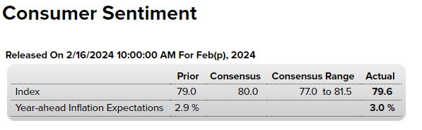 Después de dos meses de sólidas mejoras, la confianza del consumidor pareció sufrir una pausa en febrero. Los resultados preliminares del índice de confianza del consumidor de la Universidad de Michigan muestran que la confianza subió a 79.6 desde 79 en enero. La lectura estuvo un pelo por debajo de las expectativas de una lectura de 80, según FactSet, pero aún un 19% por encima de la lectura de febrero pasado.