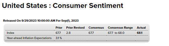 Detalles claves: Un indicador que mide lo que piensan los consumidores sobre el estado actual de la economía subió a 71.4 desde 69.8 a principios de septiembre. Una medición de las expectativas para los próximos seis meses cayó a 66.0 desde un 66.3 preliminar.