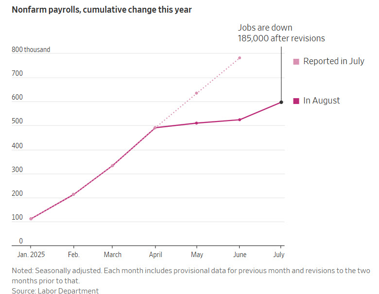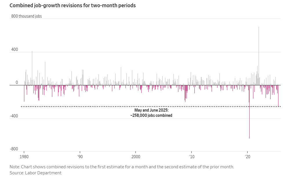 Las revisiones redujeron el crecimiento del empleo reportado originalmente para mayo y junio en un total combinado de 258,000. Esto dejó a mayo con solo 19,000 empleos añadidos y junio con tan solo 14,000.