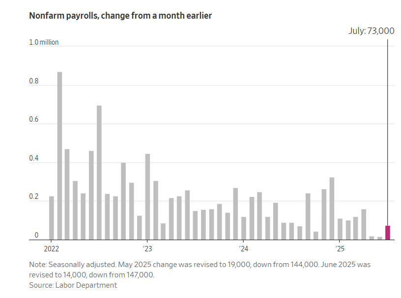 En julio, Estados Unidos creó 73,000 empleos, según un ajuste estacional, según informó el viernes el Departamento de Trabajo, cifra inferior a la esperada por los economistas encuestados por The Wall Street Journal, de 100,000 empleos.