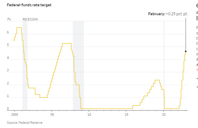 En diciembre, la mayoría de ellos planeaba elevar la tasa de los fondos federales a un rango entre 5% y 5,25% este año. Tras la subida que aprobaron el miércoles, esa proyección implicaría subidas adicionales de un cuarto de punto en las reuniones de la Fed de marzo y mayo, seguidas de una pausa en las subidas de tipos.