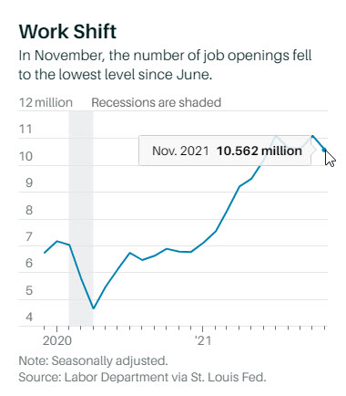 La cantidad de puestos de trabajo vacantes (puestos sin cubrir) disminuyó a 10.6 millones el último día hábil de noviembre, según ha informado hoy la Oficina de Estadísticas Laborales de EEUU. Esto es una caída de 400,000 vacantes respecto a los 11 millones del pasado mes. Por otro lado, las contrataciones cambiaron poco hasta las 6.7 millones y las personas que decidieron abandonar su trabajo aumentaron hasta un total de 6.3 millones.