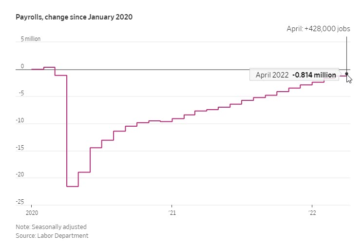 La economía de EEUU agregó 428,000 puestos de trabajo en abril, una fuerte ganancia que sugiere que el mercado laboral sigue activo a pesar del nerviosismo de los mercados bursátiles y una perspectiva económica que se oscurece. La tasa de desempleo, derivada de una encuesta diferente de hogares, se mantuvo en 3.6%, solo un poco por encima del nivel previo a la pandemia de 3.5%, dijo el viernes el Departamento de Trabajo.