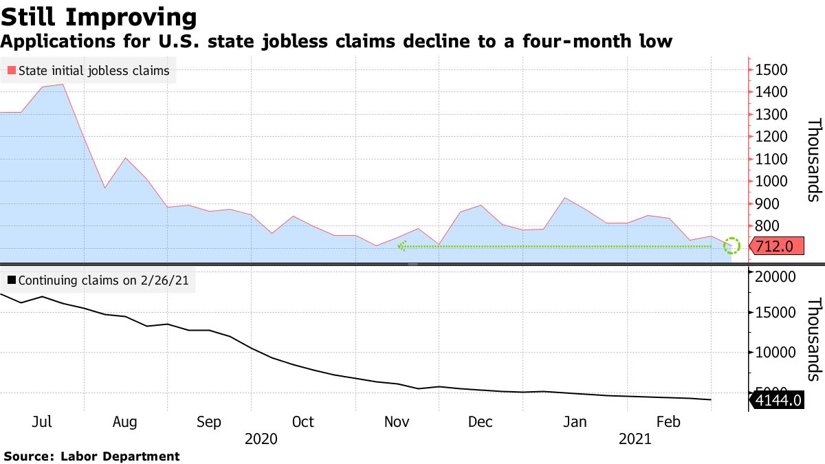 Las solicitudes de desempleo cayeron más de lo esperado y alcanzaron un mínimo de cuatro meses la semana pasada, ya que el inminente clima primaveral y más reaperturas de negocios impulsadas por las vacunas permiten que las contrataciones se recuperen.