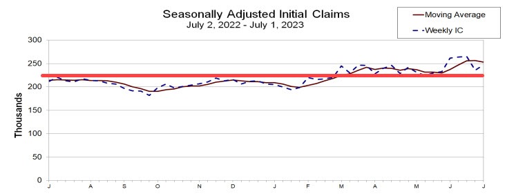 Las solicitudes iniciales se mantienen justo por encima de los mínimos históricos, lo que indica que el mercado laboral es sólido. Las solicitudes promediaron alrededor de 220,000 por semana en 2019, antes de la pandemia y cuando el mercado laboral también era fuerte.