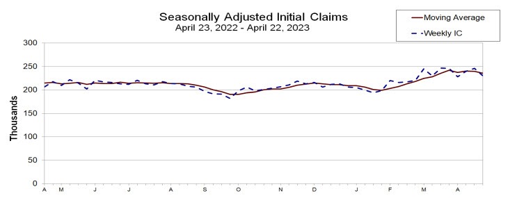 Las solicitudes iniciales de beneficios por desempleo cayeron en 16,000 a 230,000 en la semana que terminó el 22 de abril, dijo el jueves el Departamento de Trabajo. La caída casi borra las últimas dos ganancias semanales.