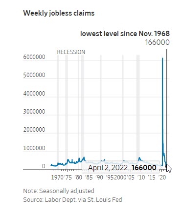 La única otra vez que las solicitudes de desempleo han sido tan bajas fue en noviembre de 1968. El gobierno comenzó a rastrear las solicitudes de desempleo en 1967.