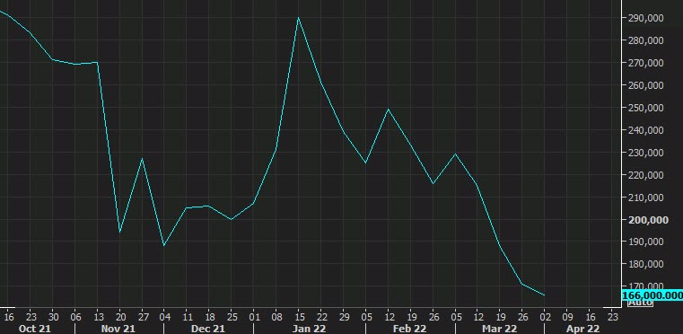 Solicitudes iniciales semanales de desempleo en EEUU 166K frente a 200K esperados.