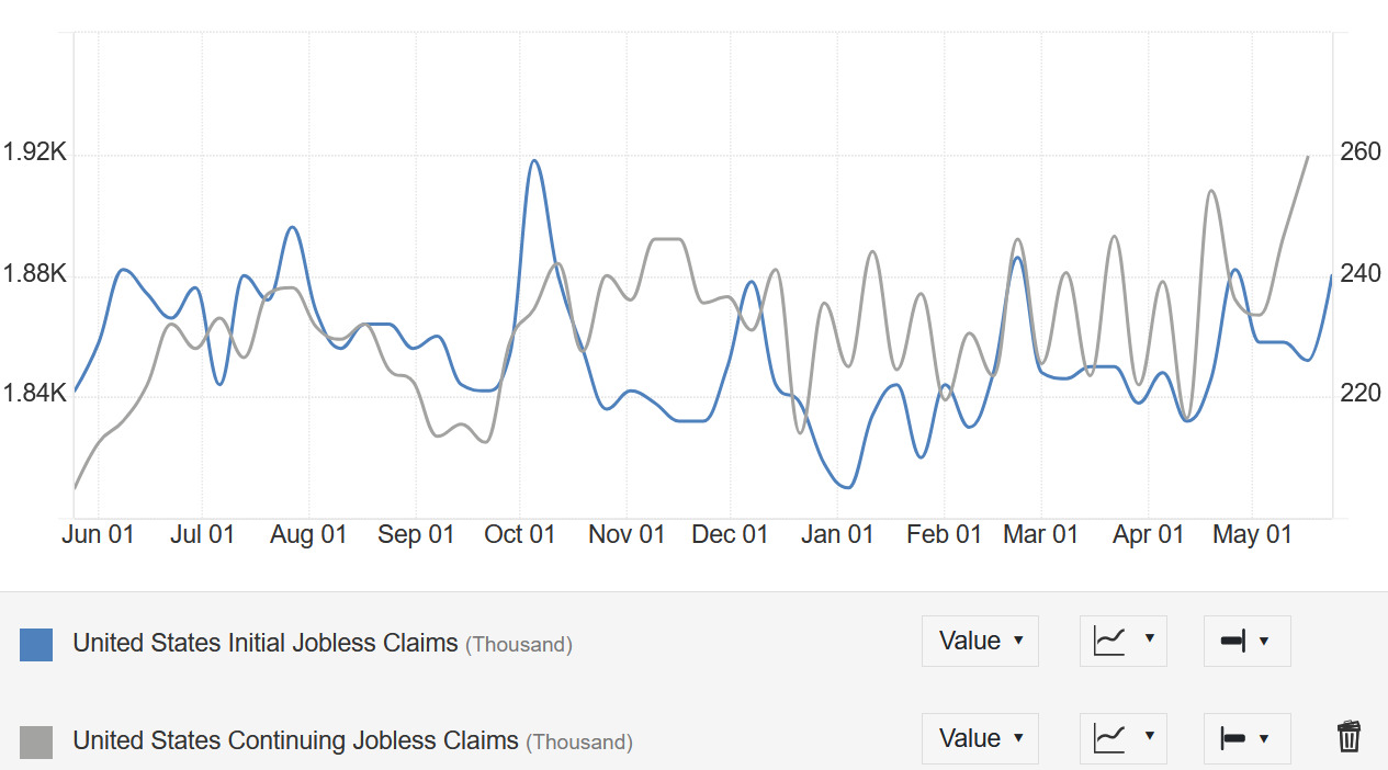 Las solicitudes continuas, una medida del tamaño total de la población desempleada, aumentaron a 1.9 millones en la semana finalizada el 10 de mayo, en comparación con los 1.87 millones de la semana anterior. Los datos de solicitudes continuas se retrasan una semana con respecto a los datos sobre nuevas solicitudes de subsidio por desempleo.