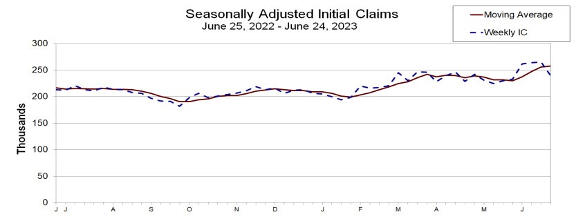 Las solicitudes iniciales de beneficios estatales por desempleo disminuyeron 26,000 a 239K ajustados estacionalmente para la semana que finalizó el 25 de junio. La caída fue la mayor desde octubre de 2021.