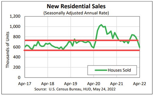 Las ventas de viviendas recién construidas cayeron un 16.6% en abril desde marzo, mucho más de lo esperado, y un 26.9% menos que en abril del 2021, según el censo de EEUU. La tasa anualizada llegó a 591,000 unidades, ajustada estacionalmente. Los analistas esperaban 750,000. La lectura de marzo también se revisó a la baja.