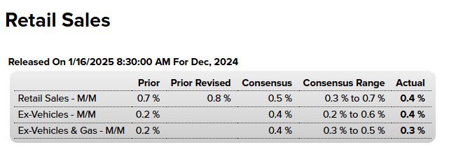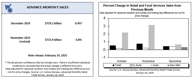 Las ventas de los minoristas estadounidenses avanzaron un 0.4% ajustado estacionalmente en diciembre, dijo el gobierno el jueves, apenas un poco por debajo del pronóstico de Wall Street.
