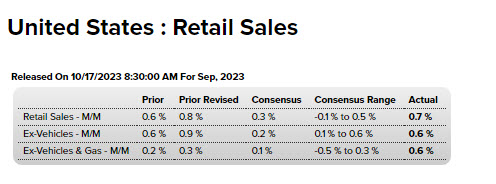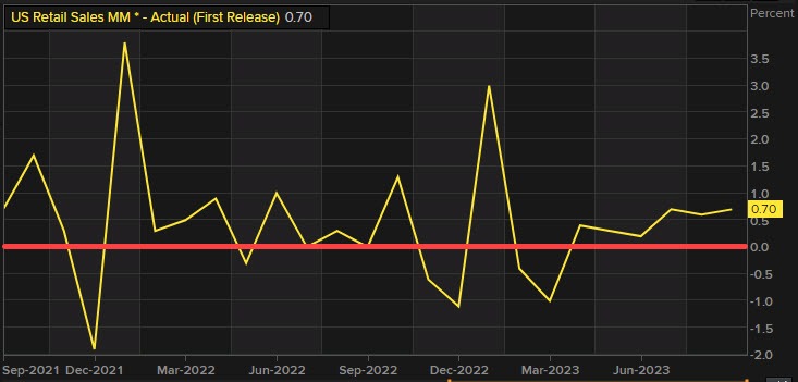 Las ventas minoristas aumentaron un 0.7% el mes pasado. Los datos de agosto se revisaron al alza para mostrar que las ventas aumentaron un 0.8% en lugar del 0.6% como se informó anteriormente. Los economistas encuestados por Reuters habían pronosticado que las ventas minoristas aumentarían un 0.3% en septiembre. Las ventas minoristas son principalmente bienes y no están ajustadas a la inflación. Subieron un 3.8% interanual en septiembre.