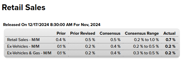 Según los últimos datos del Departamento de Comercio publicados el martes, las ventas minoristas aumentaron un 0.7% en noviembre después de aumentar un 0.5% revisado en octubre. Los economistas encuestados por The Wall Street Journal habían pronosticado que las ventas minoristas aumentarían un 0.5% en noviembre.