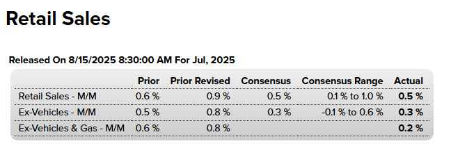 Las ventas minoristas aumentaron un 0.5% en julio con respecto a junio, según la Oficina del Censo el viernes. Si bien esto marca una desaceleración con respecto al aumento del 0.9% de junio, revisado al alza, aún indica tendencias sólidas de gasto.