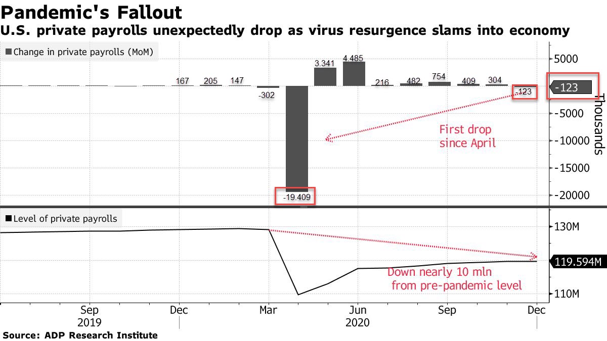 El número de empleados en empresas estadounidenses disminuyó inesperadamente en diciembre por primera vez desde abril, lo que subraya el impacto económico inmediato del aumento de casos de coronavirus en todo el país.