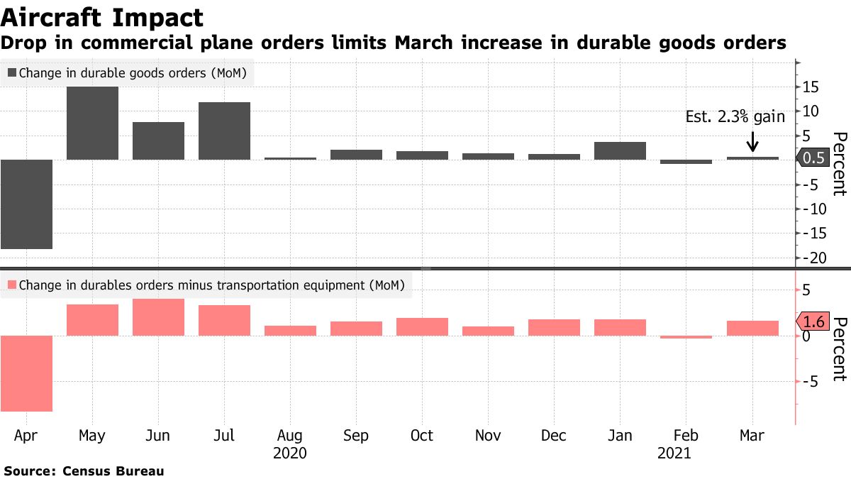 El crecimiento general de los pedidos de bienes duraderos se vio frenado por una disminución en los pedidos de aviones, y los nuevos pedidos de aviones no defensivos y piezas cayeron un 46,9% en marzo. Excluyendo el transporte, una categoría que puede ser particularmente volátil, los pedidos de bienes duraderos aumentaron 1.6%.