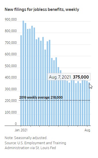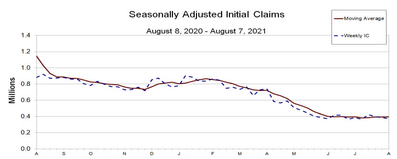 Las solicitudes iniciales de desempleo se redujeron en 12.000 a 375.000 en la semana que terminó el 7 de agosto, dijo el gobierno el jueves. Eso coincidió con el pronóstico de los economistas.