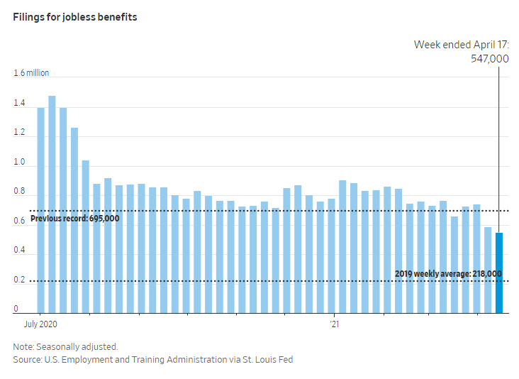 Las solicitudes iniciales de desempleo, una representación de los despidos, cayeron 39.000 la semana pasada desde 586.000 revisadas al alza la semana anterior, dijo el jueves el Departamento de Trabajo. Eso colocó los nuevos reclamos sobre una base ajustada estacionalmente por debajo de 600,000 durante dos semanas consecutivas a mediados de abril, sus niveles más bajos desde principios de 2020. El promedio móvil de cuatro semanas, que suaviza la volatilidad en las cifras semanales, fue de 651,000, también un mínimo pandémico. .